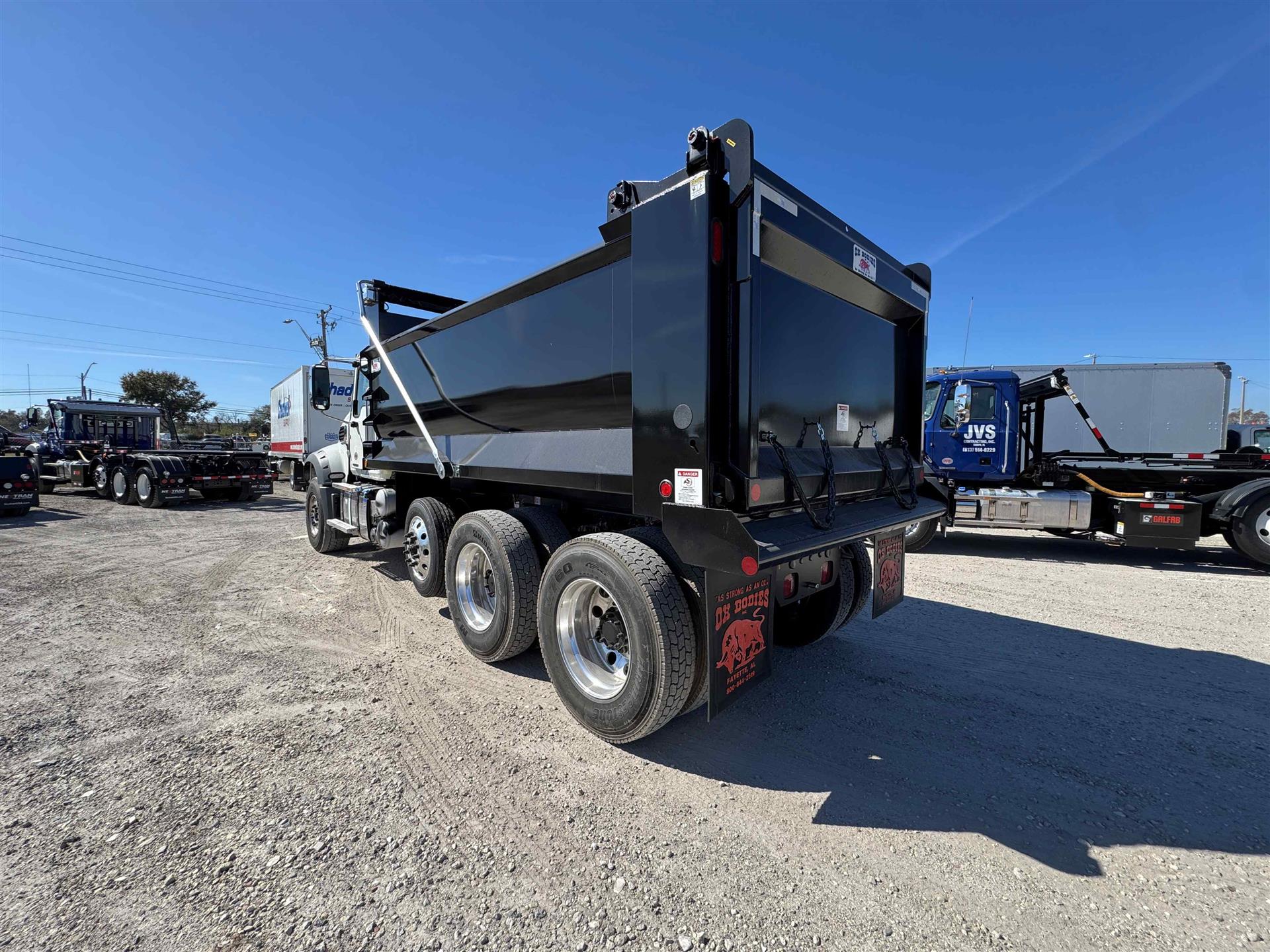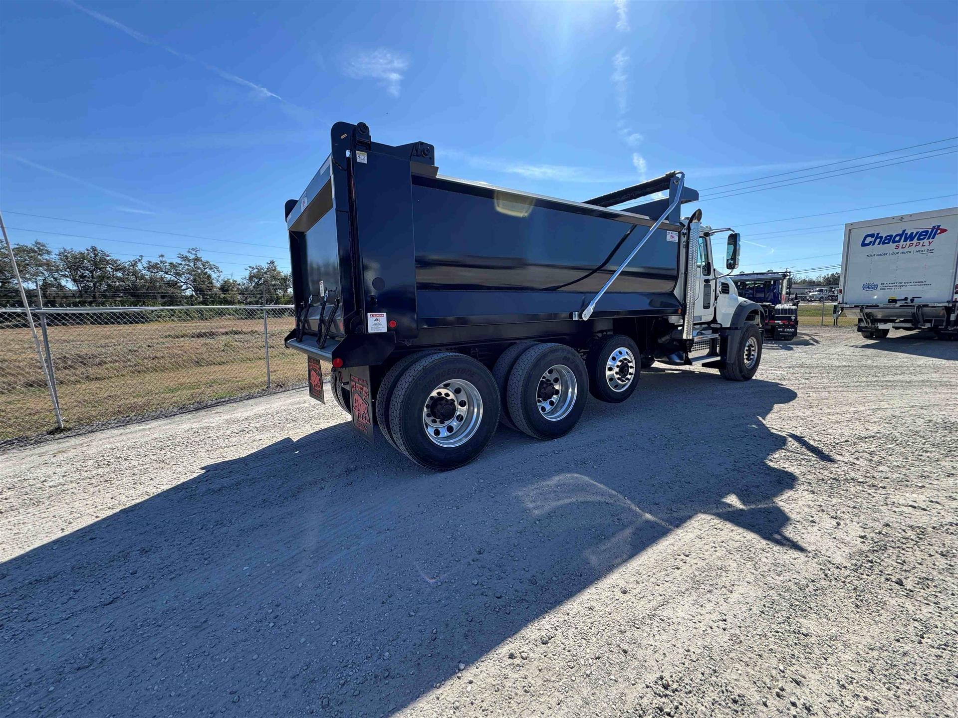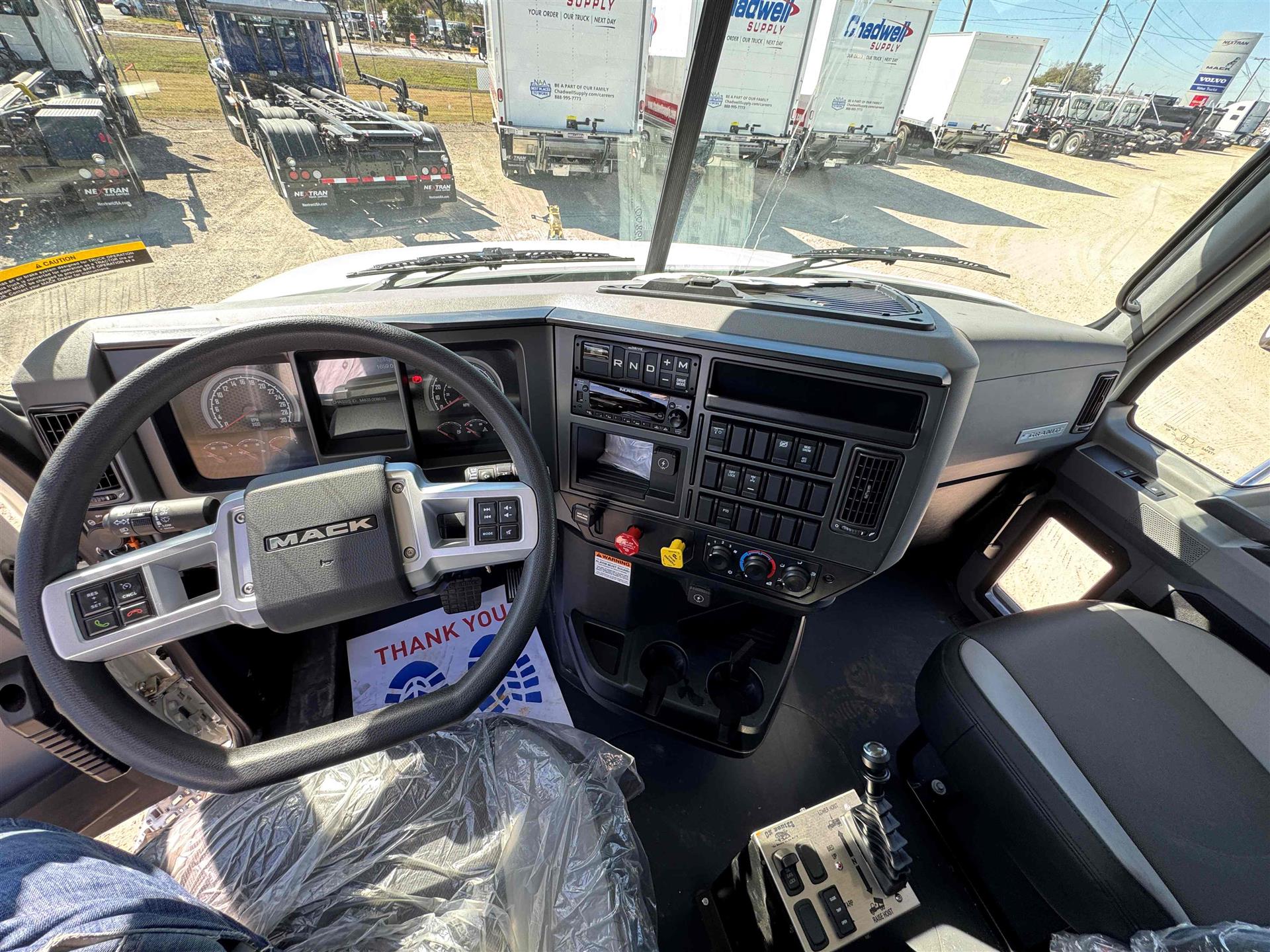 COME AND GET IT!MACK MACK MACK (GOLD DOG)ENGINE: MP8-415C MACK 415HP @ 1400-1700 RPM (PEAK) 2100 RPM (GOV) 1650 LB-FTMACK TRASNMISSION: TMD13AFO-HD mDRIVE HD 13 SP, CREEPER/ MULTI-SPEED REVERSE (OVERDRIVE) FRONT AXLE: 18000# (8200 KG) MACK FXL18 FRONT BRAKES: MERITOR EX+ AIR DISC BRAKES 430MM (17") H-TYPE REAR AXLE: 46000# (20900kg) MACK S462R CAST DUCTILE IRON HOUSING REAR SUSPENSION: MACK mRIDE 46 PARABOLIC 3-LEAF, 46,000 lb, STANDARD DUTY (17" ARTICULATION) REAR BRAKES: MERITOR "S" CAM 16.5"x7" Q+ LIFT AXLE: HENDRICKSIN 13.0K COMP. EXS13 STEER/LIFTABLE PUSHER AXLE ALL ALUMINUM WHEELS FRONT TIRES: 425/65R22.5 L BRIDGESTONE M870 REAR TIRES: 11R24.5 G BRIDGESTONE M760 |