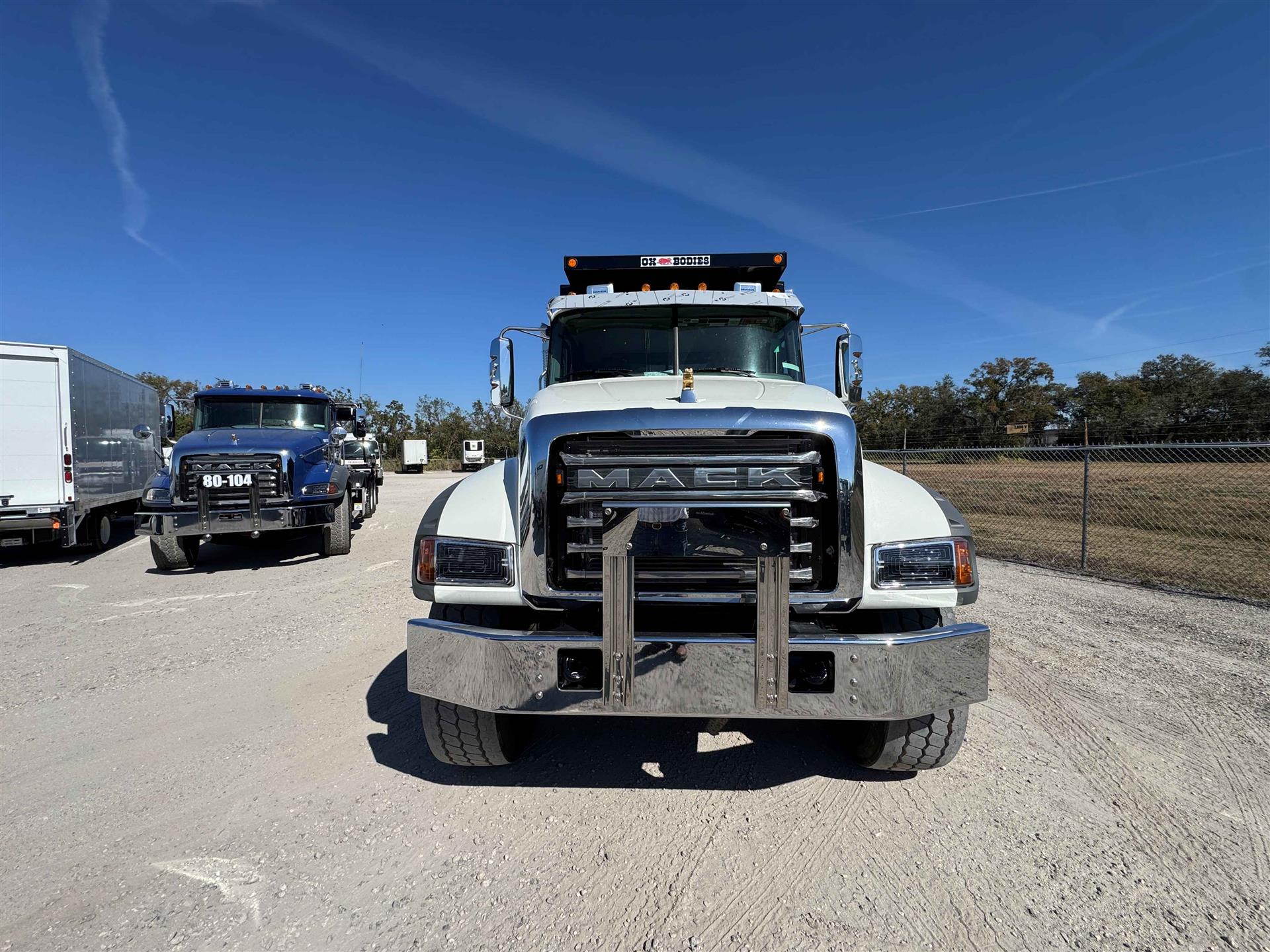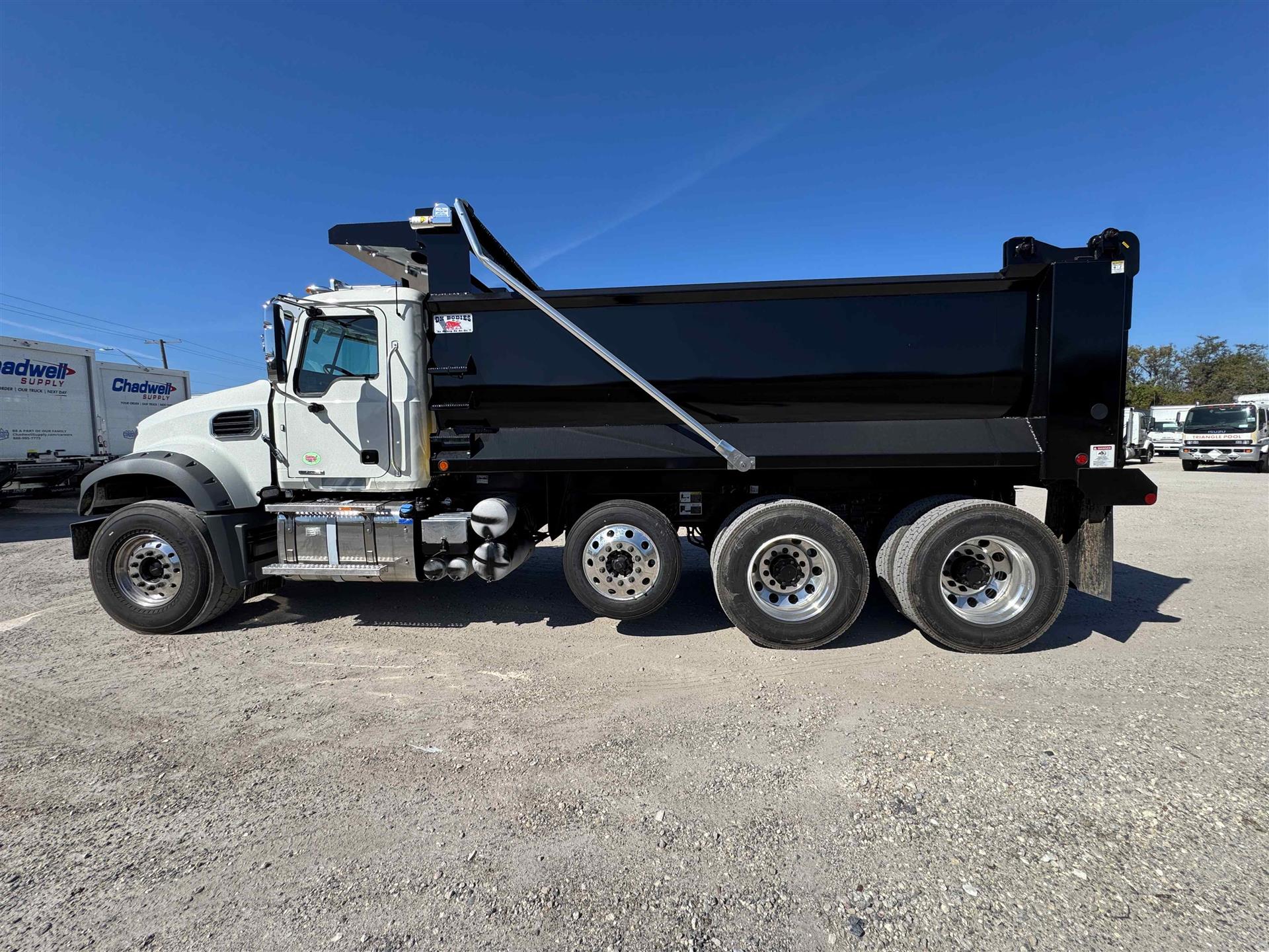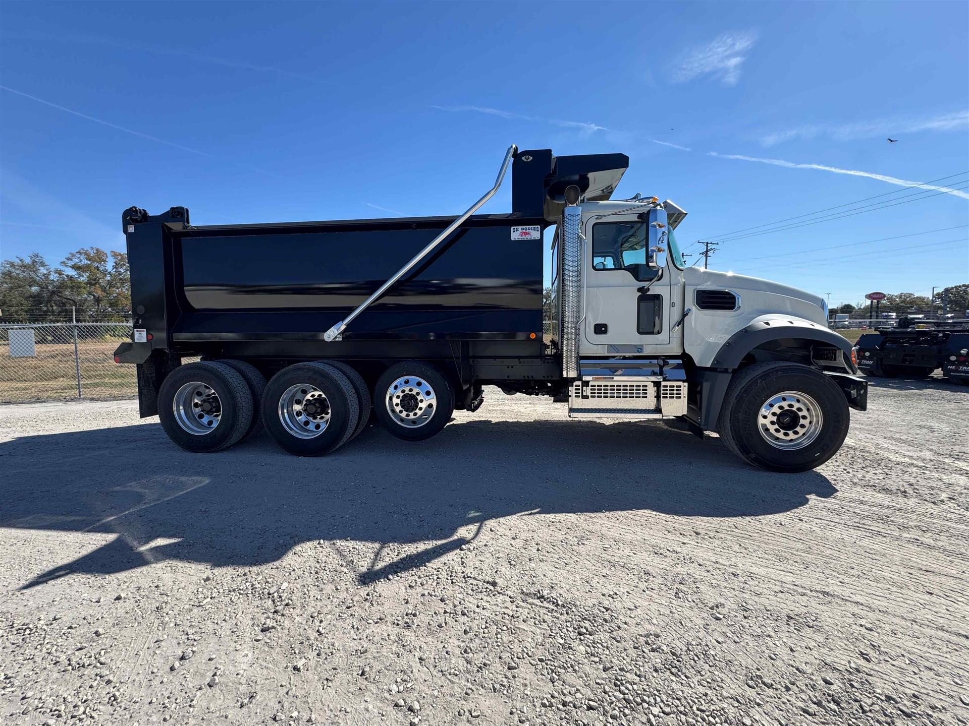 COME AND GET IT!MACK MACK MACK (GOLD DOG)ENGINE: MP8-415C MACK 415HP @ 1400-1700 RPM (PEAK) 2100 RPM (GOV) 1650 LB-FTMACK TRASNMISSION: TMD13AFO-HD mDRIVE HD 13 SP, CREEPER/ MULTI-SPEED REVERSE (OVERDRIVE) FRONT AXLE: 18000# (8200 KG) MACK FXL18 FRONT BRAKES: MERITOR EX+ AIR DISC BRAKES 430MM (17") H-TYPE REAR AXLE: 46000# (20900kg) MACK S462R CAST DUCTILE IRON HOUSING REAR SUSPENSION: MACK mRIDE 46 PARABOLIC 3-LEAF, 46,000 lb, STANDARD DUTY (17" ARTICULATION) REAR BRAKES: MERITOR "S" CAM 16.5"x7" Q+ LIFT AXLE: HENDRICKSIN 13.0K COMP. EXS13 STEER/LIFTABLE PUSHER AXLE ALL ALUMINUM WHEELS FRONT TIRES: 425/65R22.5 L BRIDGESTONE M870 REAR TIRES: 11R24.5 G BRIDGESTONE M760 |