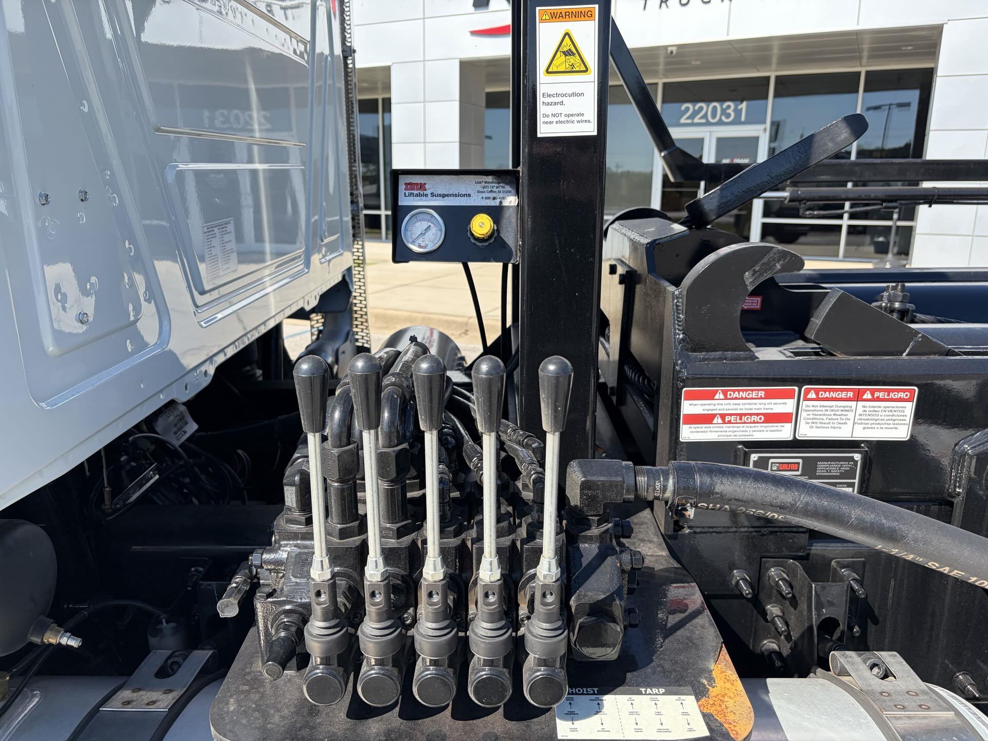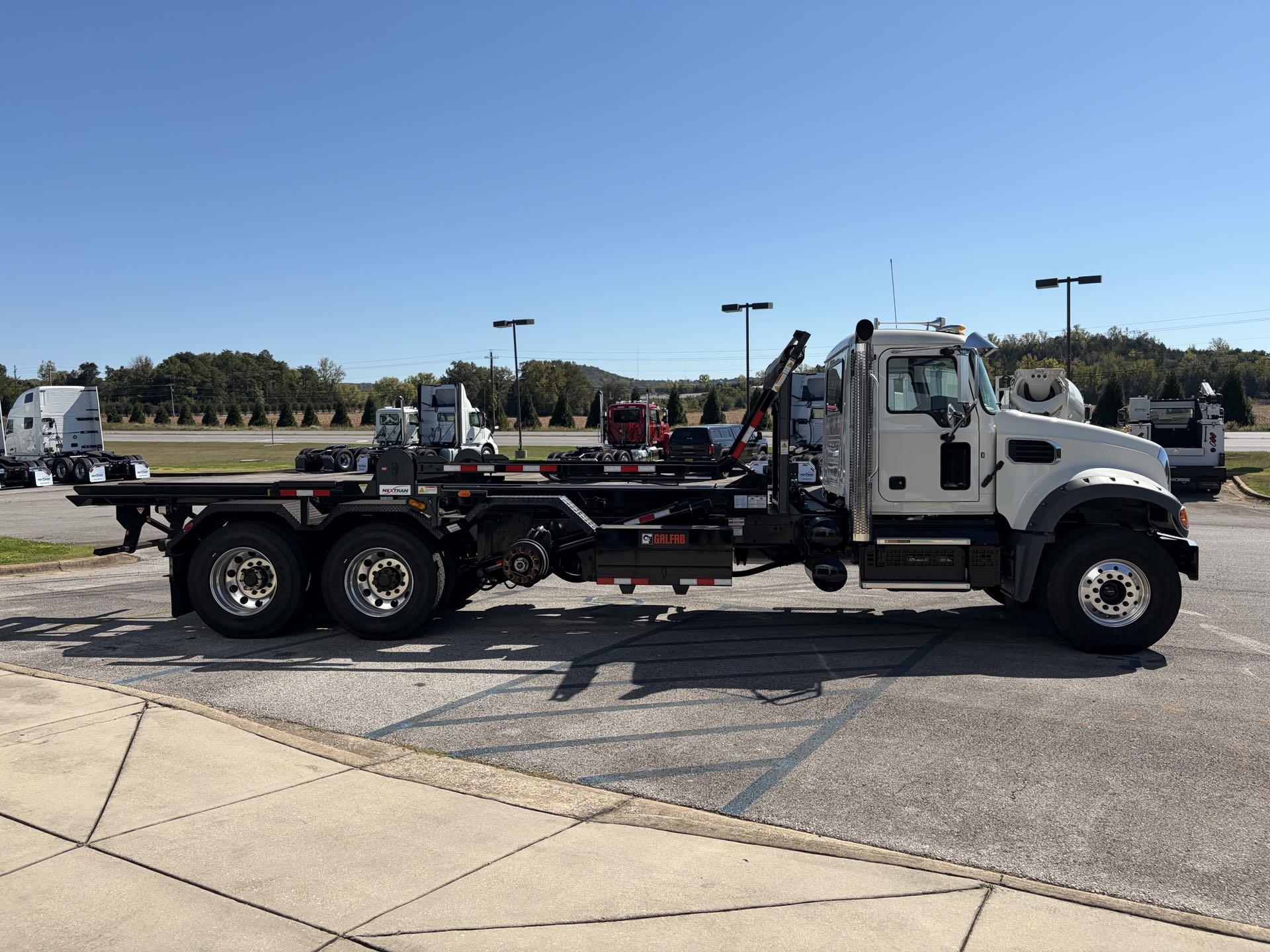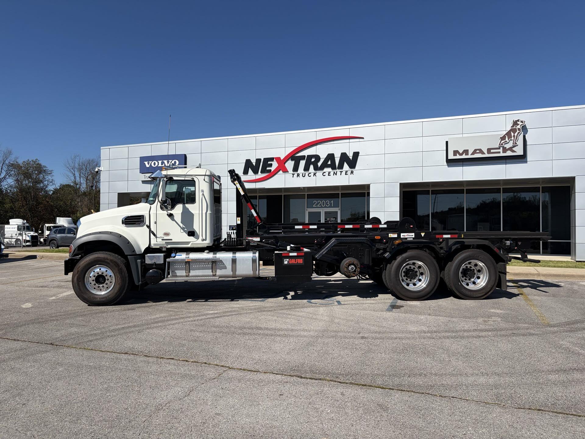 2025 Mack Granite Tri-Axle with Galfab 60,000 Lbs Cable Lift Rolloff bodied up and on the ground. This truck has a MP8 455HP with mDrive 14spd with Creeper Gears, with 20K fronts, 13K lift Axle, 46K rears on Camelback Susp. This truck is All Mack!