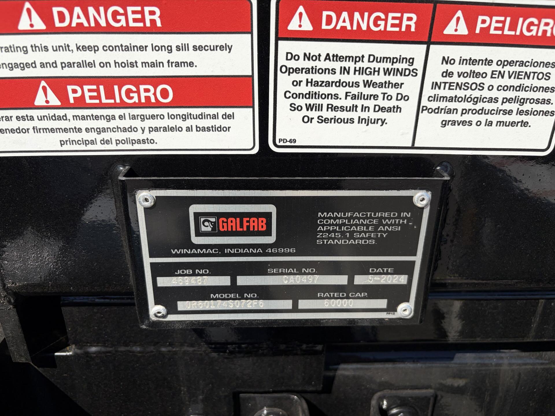 The Galfab Rolloff Body is a 60,000Lbs Cable Hoist, 23.3Ft frame length, with a Pioneer Electric Tarp.