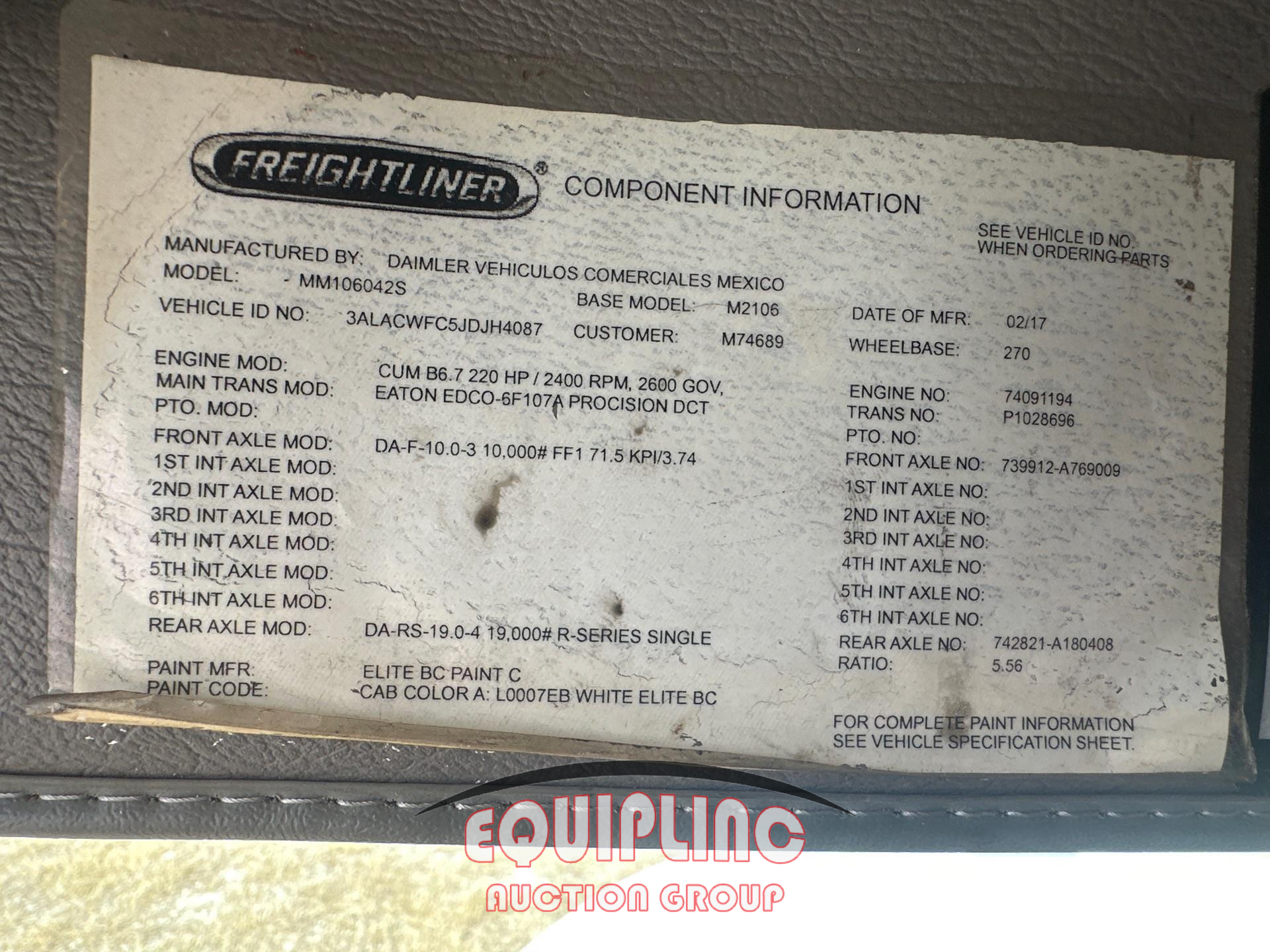 2018 FREIGHTLINER M2 4X2 S/A 26FT NON CDL BOX TRUCK SOLD AS IS UNIT DOES NOT START OR RUN- ENGINE ISSUES NO KEY CUMMINS ISB 220HP ENGINE AUTOMATIC TRANSMISSION TRANSLUCENT ROOF SECTION OF LIFTGATE TAKEN OFF IN REAR OF TRUCK HEADLINER LOOSE UNIT LOCATED IN DAYTONA BEACH, FL INSPECTION DATE 2/11/26