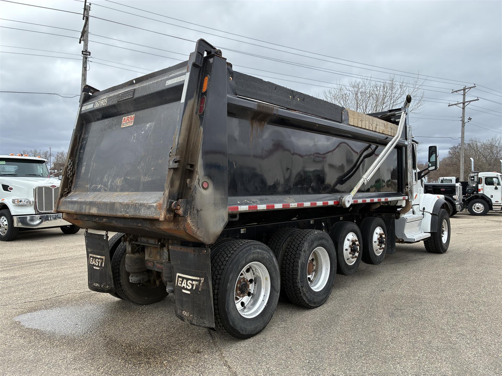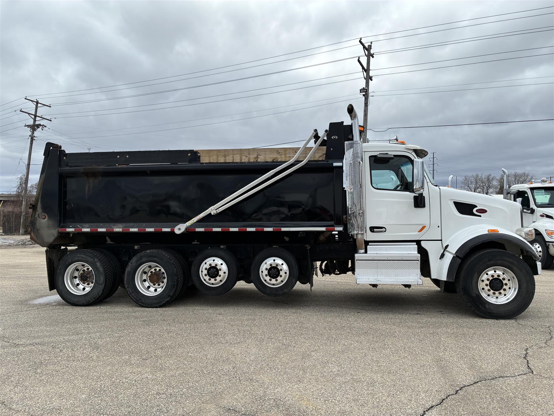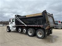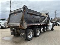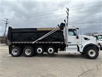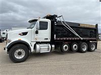 2022 Peterbilt 567 Quad Axle Dump Truck, 455hp Paccar MX-13, Allison 6spd transmission, 20k front axle, 40k rears on Peterbilt Air Trac suspension with 4.33 gears, two Watson-Chalin 10k self-steering pusher axles, 90gal fuel capacity, 256'' wheelbase, 3/4 lockers, sun visor, cloth interior, 19x48x60 steel Brandon dump body |