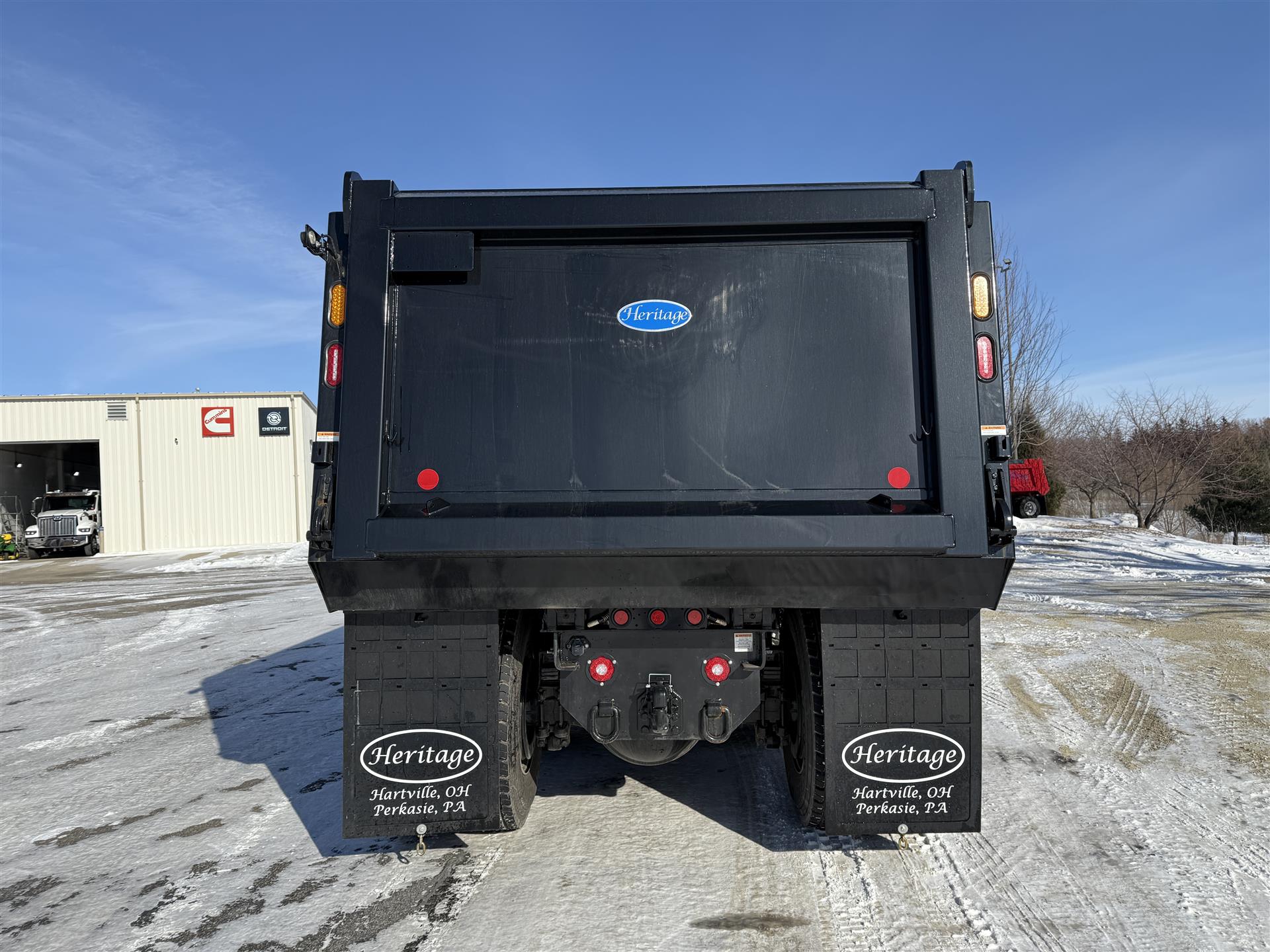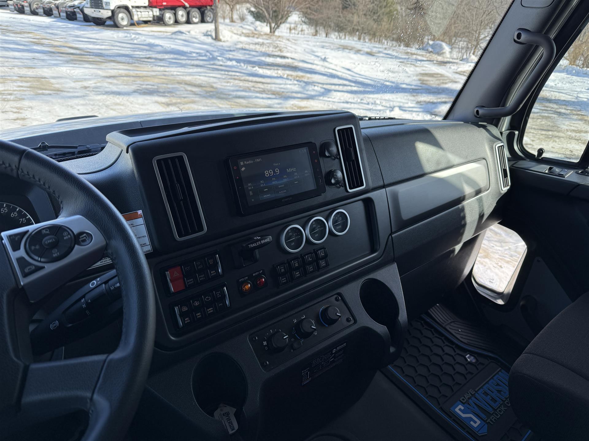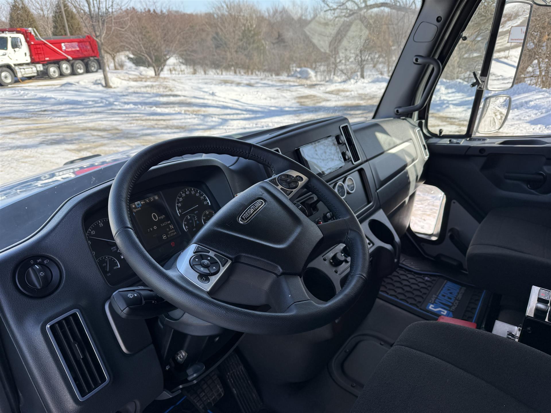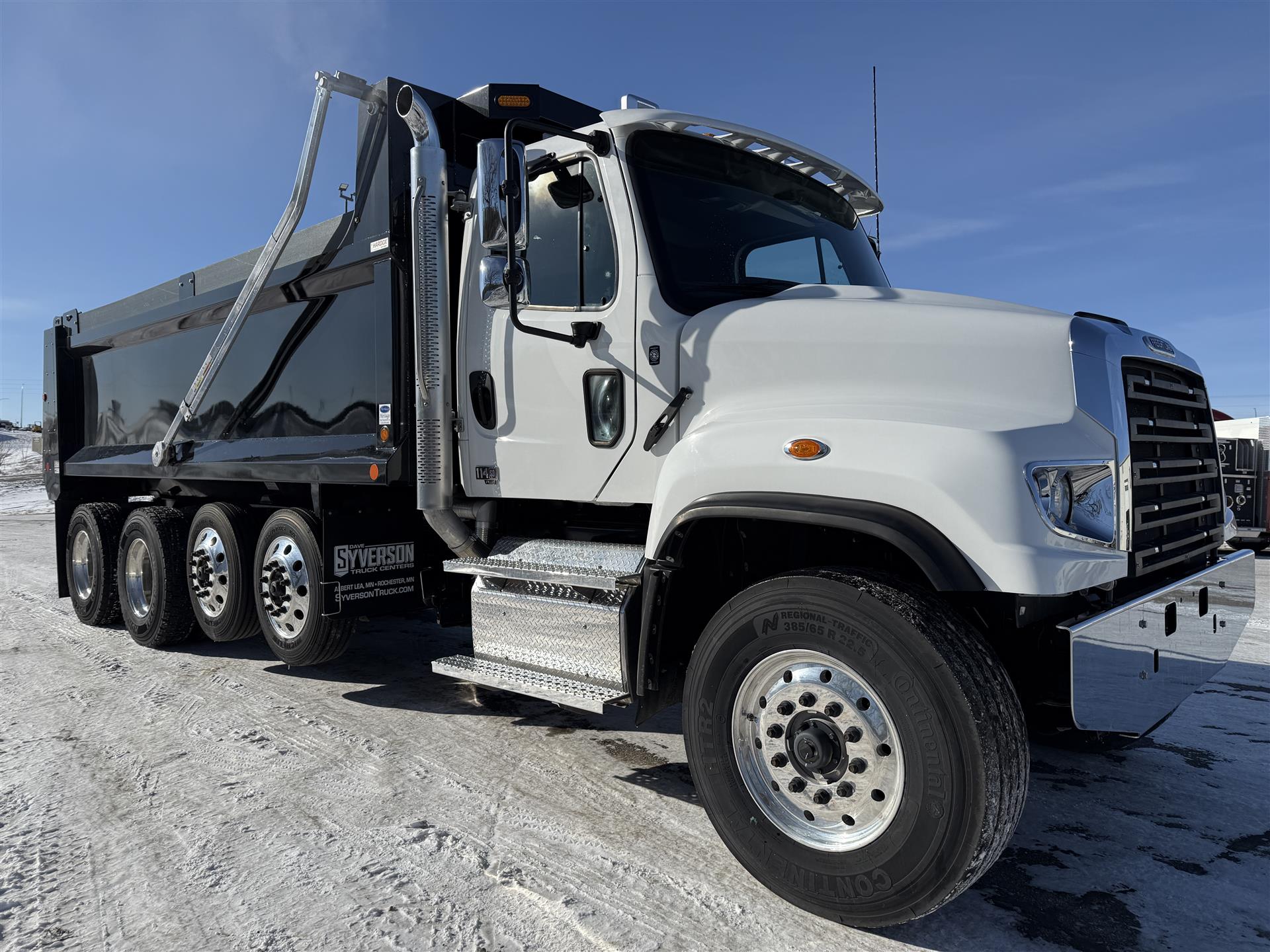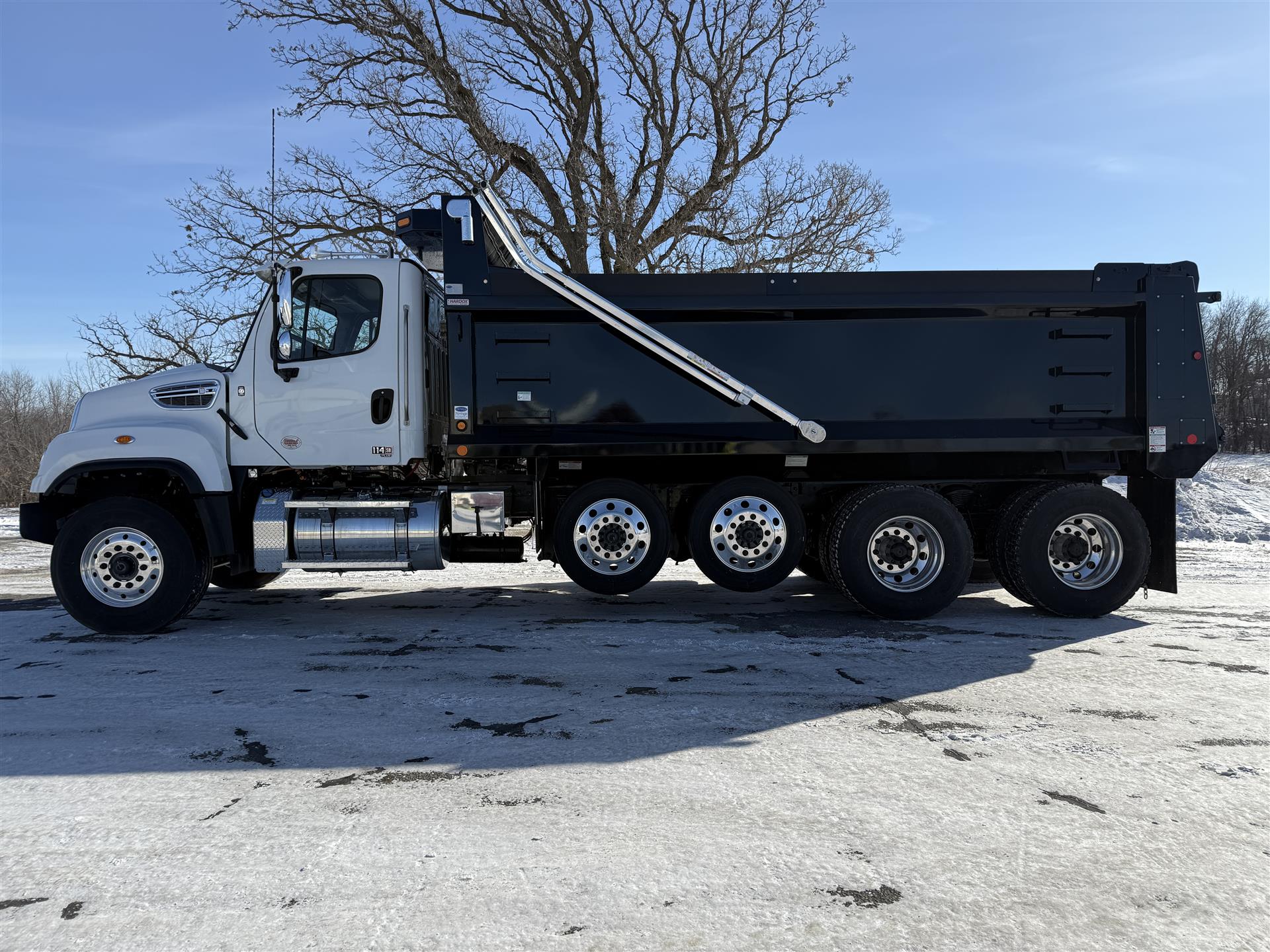 2026 Freightliner 114SD Quad Axle Dump Truck, DD13 470HP, Allison Transmission, 18K Front Axle, 46K Rear Axle, (2) 13,500# Hendrickson Steerable Pusher Axles, J-Craft 19'6" Smooth Side Body Painted Black, Heated Body, Tarp, Poly Side Boards, Pull Plate Hitch Package, High Lift Gate, Chrome Accents, Block Heater, All Aluminum Wheels, Premium Cab and Truck insulation, Premium LED Cab Lighting, Polished Diamondplate DEF and Aftertreatment Covers, Polished Fuel tank With Stainless Steel Bands, Backup Alarm, Leather Steering Wheel. |